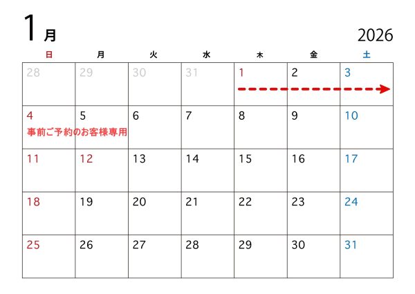 2026年1月4日・5日をご予定の方は、2025年12月20日までにご予約をお願いいたします。